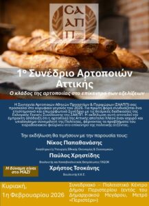 Η Συντεχνία Αρτοποιών Αθηνών Προαστίων & Περιχώρων (ΣΑΑΠΠ) διοργανώνει το 1ο Συνέδριο Αρτοποιών Αττικής, το οποίο θα πραγματοποιηθεί την Κυριακή, 1η Φεβρουαρίου 2026, στο Συνεδριακό – Πολιτιστικό Κέντρο του Δήμου Περιστερίου (εντός του Δημαρχιακού Μεγάρου).