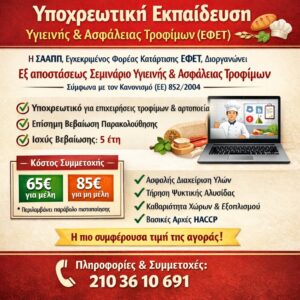 Στο πλαίσιο της συμμόρφωσης με την ισχύουσα νομοθεσία και σύμφωνα με τις απαιτήσεις του Κανονισμού (ΕΕ) αριθ. 852/2004, σας ενημερώνουμε ότι η εκπαίδευση σε θέματα Υγιεινής και Ασφάλειας Τροφίμων (ΕΦΕΤ) είναι υποχρεωτική για όλους τους εργαζόμενους σε επιχειρήσεις τροφίμων και αρτοποιεία και πρέπει να ανανεώνεται κάθε 5 χρόνια.
